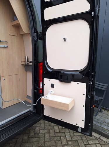 - Een buscamper interieur zonder douchecabine (maar mét buitendouche)