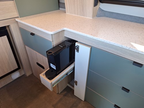 Wanneer het eens niet uitkomt om buiten te koken kan er natuurlijk ook binnen gekookt worden u kunt dan de uitrijbare opberg box waar ook de Porta-Potty inzit gebruiken als krukje. De opberg box heeft ook een deksel die weer gebruikt kan worden als opstapje om makkelijker in het bed te komen wanneer deze is uitgeschoven, dan kunt u de opberg box waar de Porta-Potty inzit bij de schuifdeur plaatsen waardoor u in de nacht gebruik kunt maken van het toilet.