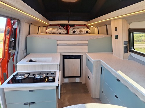 De AmorA Spazio 1 op basis van een Ford Transit Custom PHEV met buitenmaat van 500cm is echt een stads camper maar dan met een bed maat van een volwassen camper...